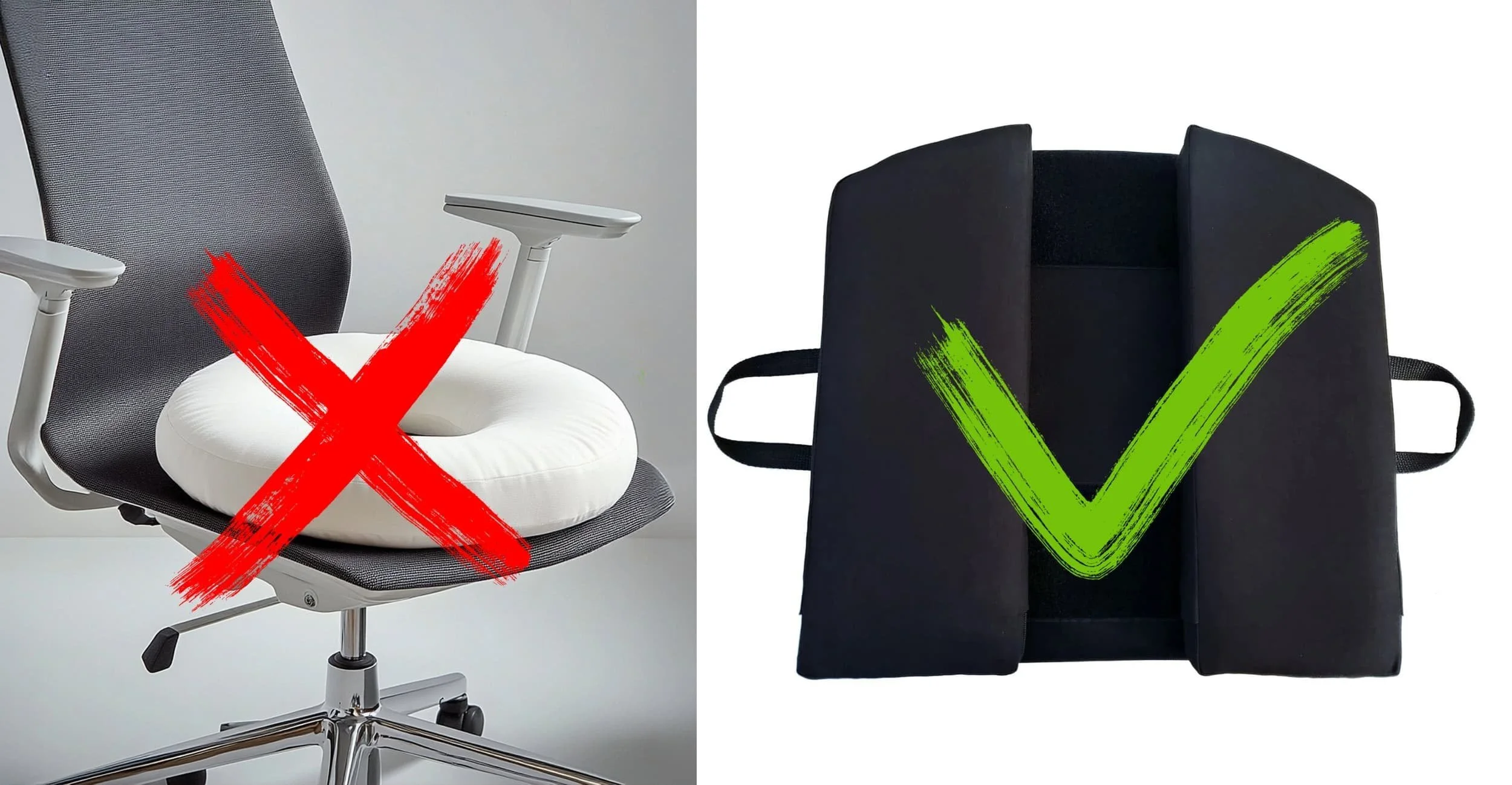 And donut cushions? Those take pressure off the center but increase pressure on the pelvic floor and sit bones. Many people feel worse using them.